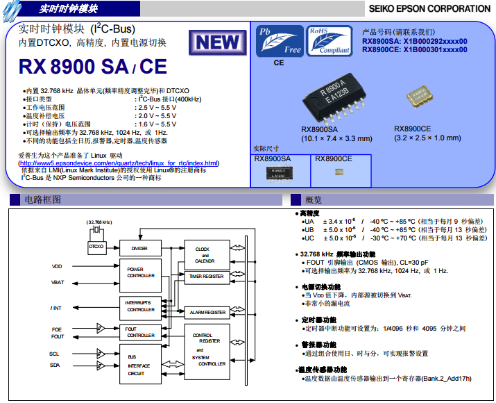 愛普生時(shí)鐘芯片模塊RX-8900共有兩種型號分別為RX-8900SA和RX-8900CE,兩種同屬8900系列肯定有較多共同點(diǎn),如均內(nèi)置32.768KHz晶體單元,DTCXO數(shù)字溫補(bǔ)晶振,均有高精度穩(wěn)定性,內(nèi)置電源切換,應(yīng)用在安防等,消費(fèi)類等。