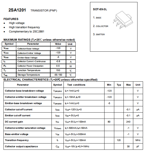 大家好,今天來介紹下三極管2sa1201,2sa1020。說到這很多客戶就要問了這兩者為何放在一起比較,其實(shí)是有一件趣事,上周我們客服收到一位老客戶咨詢,他說要2sa1020一盤然后放大倍數(shù)120-240,也沒說封裝就付了款,因?yàn)樗琴Q(mào)易經(jīng)常來拿貨,既然說了2sa1020和放大倍數(shù),那就應(yīng)該沒錯(cuò)就2sa1020  TO-92L 120~240  絲印A1020 041 這顆長(zhǎng)用料,客戶收到貨后,跟我們要求換貨,原來他要的居然是2sa1201,不過說起來這兩者光看型號(hào)確實(shí)容易混淆,但是2sa1201貼片三極管,而2sa1020直插三極管,這就有點(diǎn)無語(yǔ)了,其實(shí)他當(dāng)時(shí)如果說下封裝,我們就可以立馬反應(yīng)過來 比如他說 SOT-89封裝,那我們就會(huì)知道應(yīng)該不是2sa1020,而是2sa1201。這位老客戶也說了他是當(dāng)時(shí)忙暈了,他知道是2sa1201,卻打字打成2sa1020。我們也幫他辦理了換貨,下面南山電子就詳細(xì)給大家分享下2sa10202sa1201的規(guī)格書