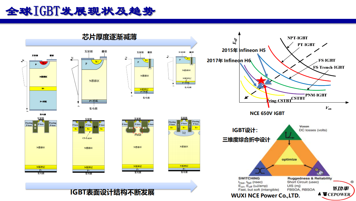 IGBT模塊產(chǎn)品發(fā)展的趨勢是芯片厚度逐漸減薄,IGBT表面涉及結(jié)構(gòu)不斷發(fā)展。隨著以軌道交通為代表的新興市場和新能源車行業(yè)的興起,將進一步為