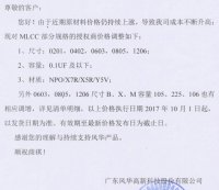 自2016年第三季度至今,被動元件價格持續(xù)上漲,至今已經(jīng)有過幾輪,風(fēng)華電容近日又再一次向各代理商下方了統(tǒng)一漲價通知,最新價格生效時間為2017年10月1日。產(chǎn)品主要涉及 MLCC 和 R...