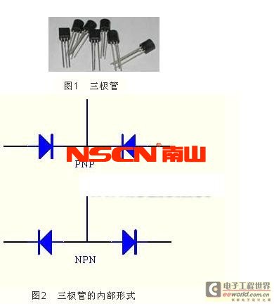 大家知道,三極管是含有兩個(gè)PN結(jié)的半導(dǎo)體器件。根據(jù)兩個(gè)PN結(jié)連接方式不同,可以分為NPN型和PNP型兩種不同導(dǎo)電類型的三極管,圖1是它們的電路符號(hào)和等效電路。