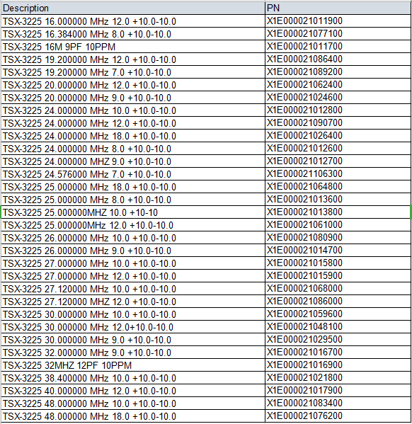 今天給大家介紹適用于便攜式無(wú)線傳輸設(shè)備的3225無(wú)源晶振TSX-3225。說(shuō)到3225無(wú)源晶振那么就不得不提下TSX-3225,ESPON的TSX-3225產(chǎn)品已經(jīng)非常成熟,已經(jīng)在各個(gè)產(chǎn)品各種應(yīng)用環(huán)境中都有成熟的應(yīng)用,業(yè)內(nèi)人都知道,雖然愛(ài)普生已經(jīng)開(kāi)發(fā)出2520甚至更小尺寸2016無(wú)源晶振,但是尺寸更小,也代表著制造工藝越發(fā)繁瑣成本的增高,現(xiàn)在很多便攜式產(chǎn)品需要尺寸小,高性能,壽命長(zhǎng),價(jià)格適中的貼片晶振,3225已經(jīng)相對(duì)而言屬于小尺寸晶振,可以滿足便攜式設(shè)備的要求,價(jià)格也比2520,2016要低,厲害的是,TSX-3225無(wú)源晶振的成本比5032的也低,所以說(shuō)TSX-3225是性?xún)r(jià)比較高的的選擇。TSX-3225常用的型號(hào)中TSX-3225 24MHz 12PF±10PPMTSX-3225 16MHz 12PF 10PPM都是比較常用的兩顆料,工作溫度:-40℃ ~ +85℃。TSX-3225系列無(wú)源晶振是一款應(yīng)用比較廣泛的愛(ài)普生無(wú)源晶振。因?yàn)槠漕l率范圍覆蓋16MHz~48MHz。可以用于移動(dòng)電話,藍(lán)牙,無(wú)線-局域網(wǎng),ISM 頻段電臺(tái)廣播,MPU時(shí)鐘等領(lǐng)域。下面南山電子就把TSX-3225的常用的標(biāo)準(zhǔn)頻率表分享給大家